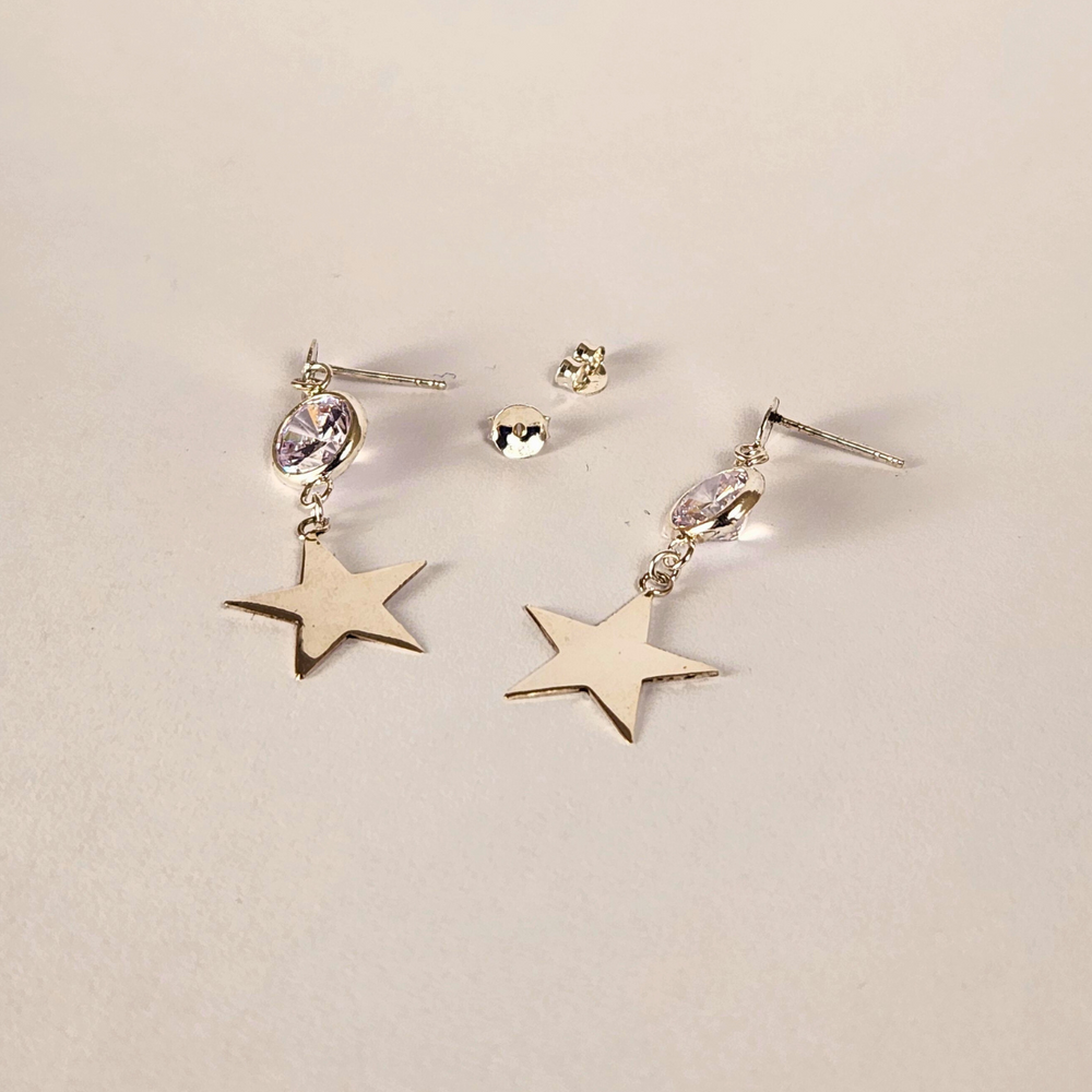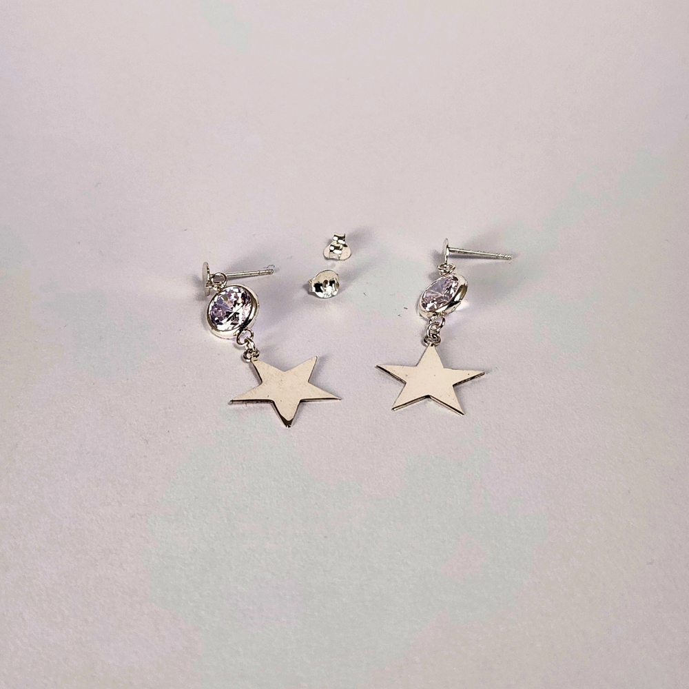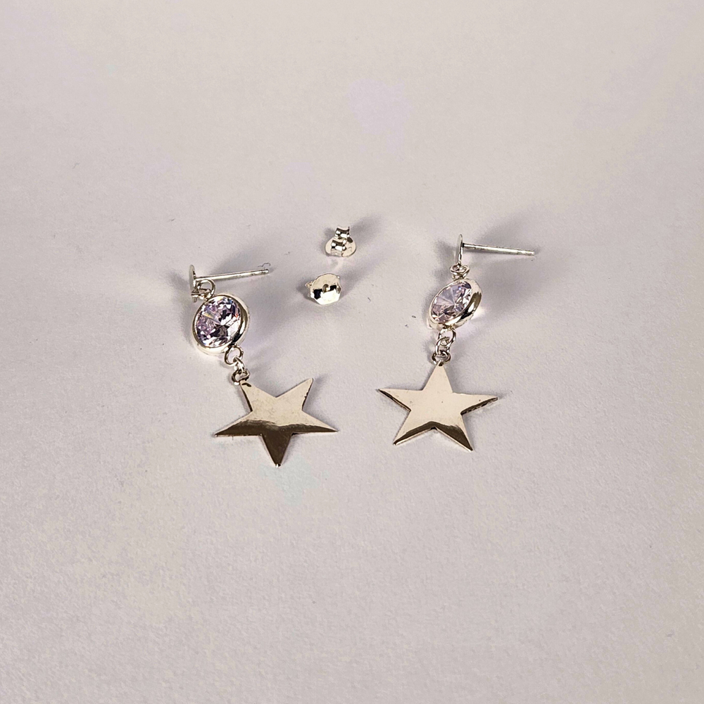 Ilumina tu estilo con estos elegantes aros de plata 925 con diseño colgante de estrella. Cada pieza cuenta con una zirconia cúbica facetada que refleja la luz con un brillo espectacular, aportando un toque moderno y femenino a tu look diario o de noche.